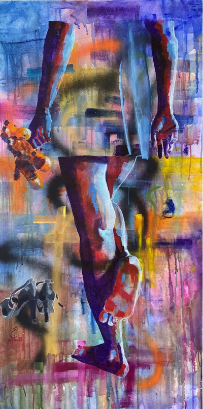 The idea of this painting is to create a connection between the viewers and the feeling of a young girl who is walking toward adulthood. She is holding a staffed animal and is walking toward high heel shoes. I have kept the interpretation open for the viewer.